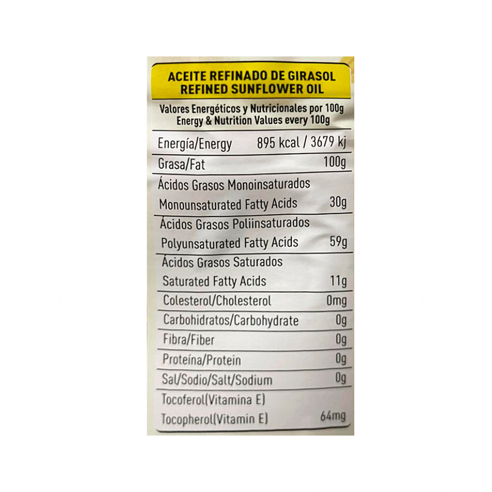 Ingredientes: aceite de girasol refinado. Contiene: 10 Litros Información nutricional por 100 ml