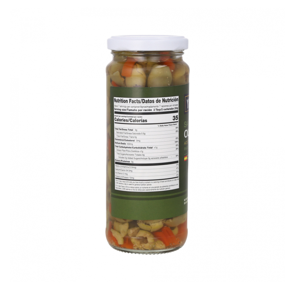 Añádele un toque de frescura a tus recetas con las aceitunas Yeya , una mezcla irresistible de aceitunas sin semilla y pimientos en tiras. Disfruta estos deliciosos y convenientes productos en ensaladas o como aperitivos. También son exquisitos en empanadas, pizzas, aperitivos o bien como refrigerio directamente del frasco. Nuestras aceitunas provienen de las mejores arboledas de Andalucía, España, se cosechan y mezclan para su placer con tiras de jugosos pimientos.