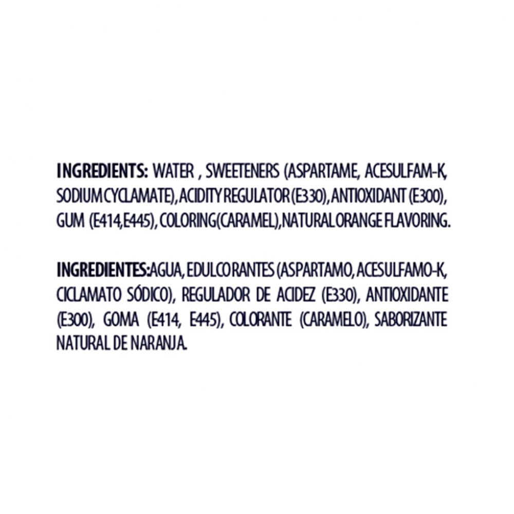Ingredientes: agua, edulcorantes (aspartamo, acesulfamo-K, ciclamato sódico), corrector de acidez (E330), antioxidante (E300), goma (E414, E445), colorante (caramelo), aroma natural de naranja.