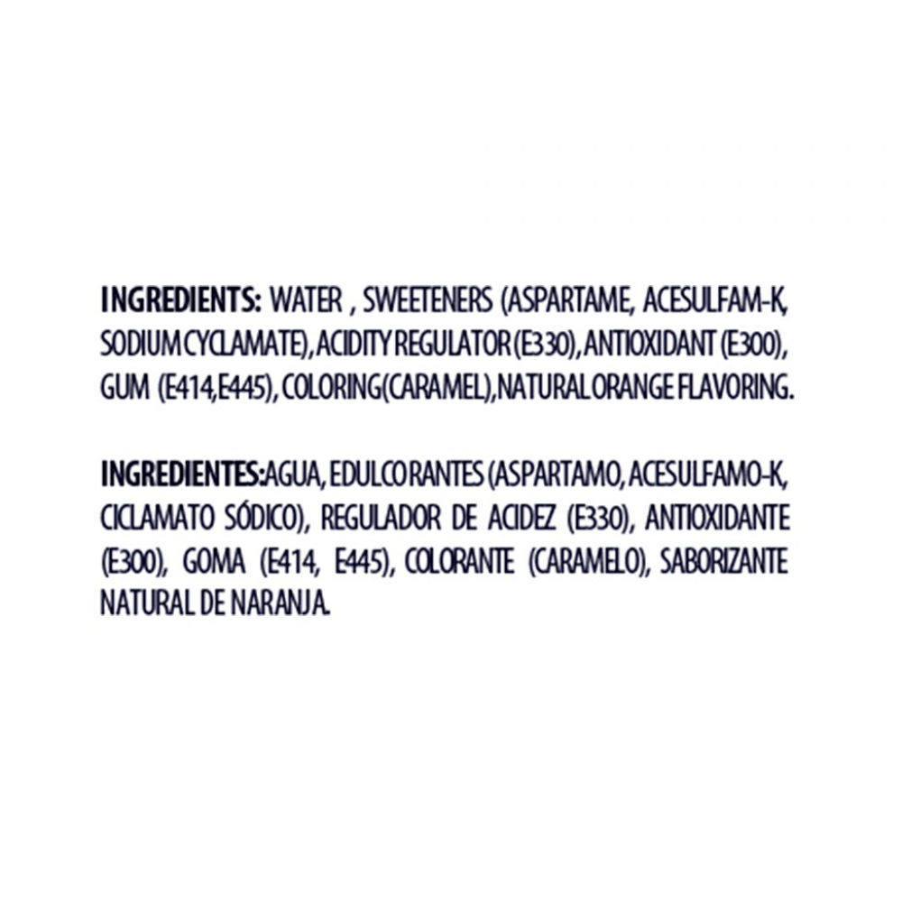 Ingredientes: agua, edulcorantes (aspartamo, acesulfamo-K, ciclamato sódico), corrector de acidez (E330), antioxidante (E300), goma (E414, E445), colorante (caramelo), aroma natural de naranja.