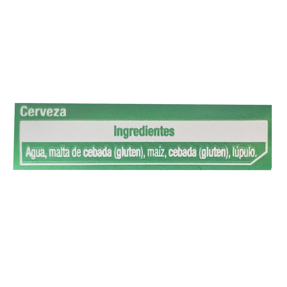 Ingredientes: Agua, malta cebada (gluten), maÃz, cebada (gluten), lúpulo. Alcohol 4.8 % vol. PaÃ
