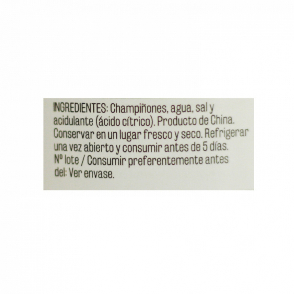 Ingredientes: Champiñones, agua, sal y acidulante (ácido cítrico). País de origen: España.