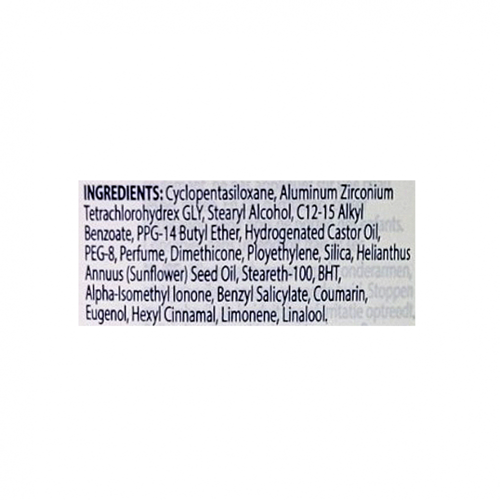 Ingredientes: ciclopentasiloxano, tetraclorohidrex gly de aluminio y circonio, alcohol estearílico, benzoato alquílico c12-15, éter butílico ppg-14, aceite de ricino hidrogenado, peg-8, perfume, dimeticona, polietileno, sílice, aceite de semilla de helianthus annuus (girasol), esteareth- 100, bht, alfa-isometil ionona, salicilato de bencilo, cumarina, eugenol, hexil cinamal, limoneno, linalool.