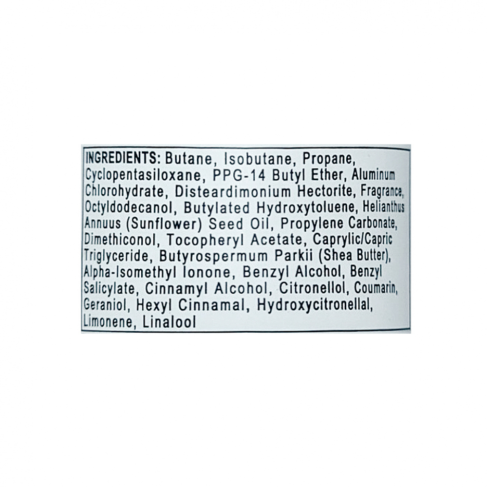 Ingredientes: butano, isobutano, propano, ciclopentasiloxano, éter butÃlico ppg-14, clorhidrato de aluminio, hectorita de disteardimonio, fragancia, octildodecanol, hidroxitolueno butilado, aceite de semilla de helianhm annuus (girasol), carbonato de propileno, dimeticonol, acetato de tocoferilo, tiglicérido caprÃlico/cáprico, butyrospermum parkii (manteca de karité), alfa-isometil ionona, alcohol bencÃlico, salicilato de bencilo, alcohol cinamÃlico, citronelol, cumarina, geraniol, hexil cinamal, hidroxicitronelal, limoneno, linalool.