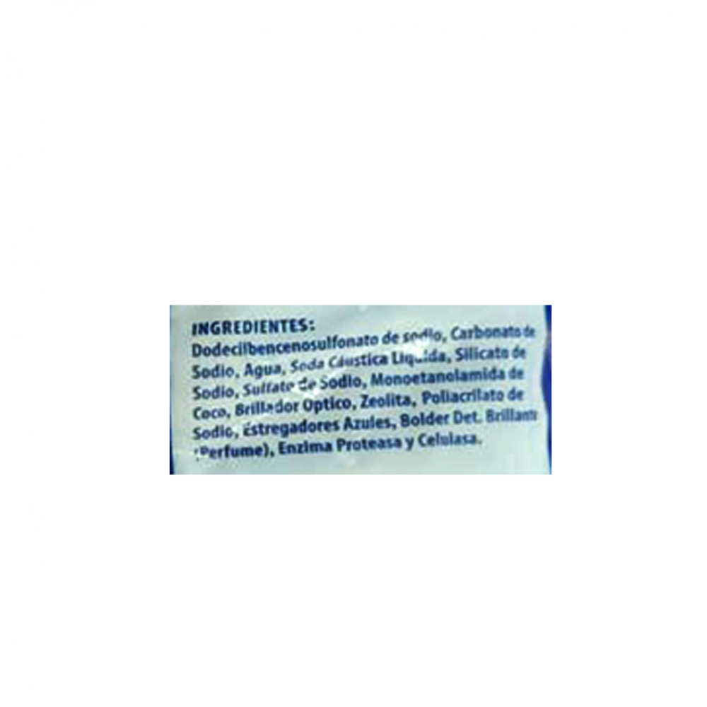 Dodecilbencenosulfonato de sodio, Carbonato de sodio, Agua, Soda Caústica LÃquida, Silicato de sodio, Sulfato de sodio, Monoetanolamina de coco, Brillador óptica, Zeolita, Poliacrilato de sodio, Estregadores azules, Bolder Det. Brillante (Perfume), Enzima Proteasa y Celulasa.