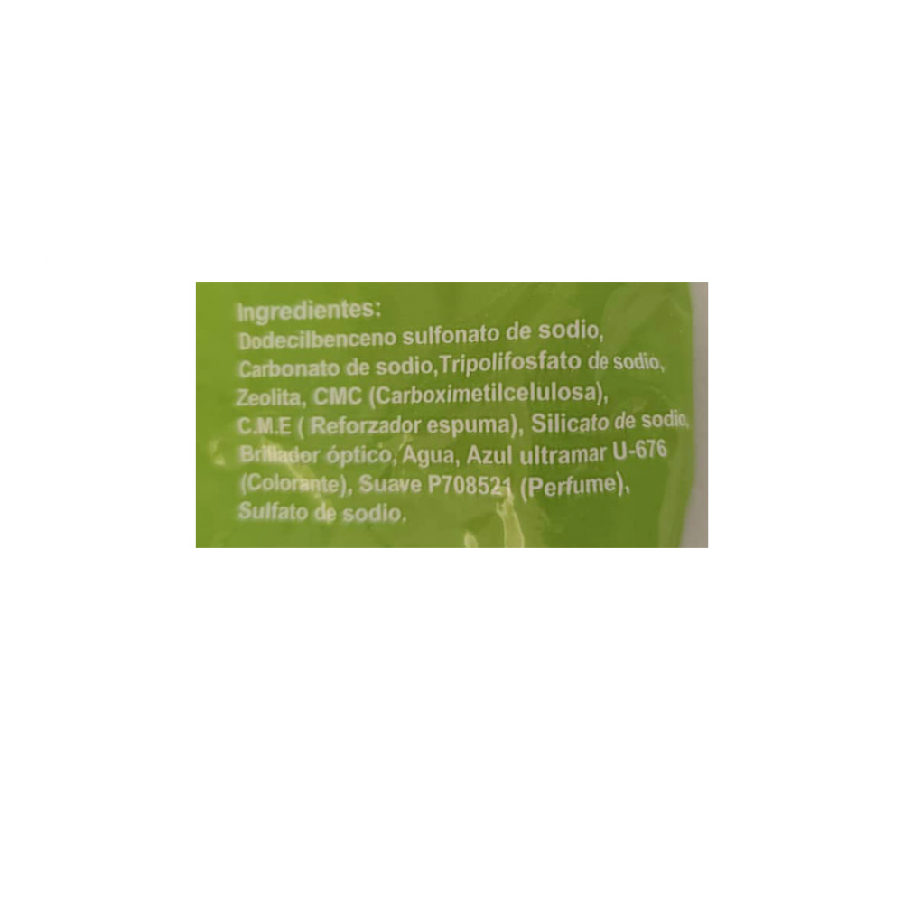 Dodecilbenceno sulfonato de sodio, Carbonato de sodio, Tripolifosfato de sodio, Zeolita, CMC (Carboximetilcelulosa), C.M.E (Reforzador espuma), Silicato de sodio, Brillador óptico, Agua, Azul ultramar U-676 (Colorante), Suave P708521 (Perfume), Sulfato de sodio.
