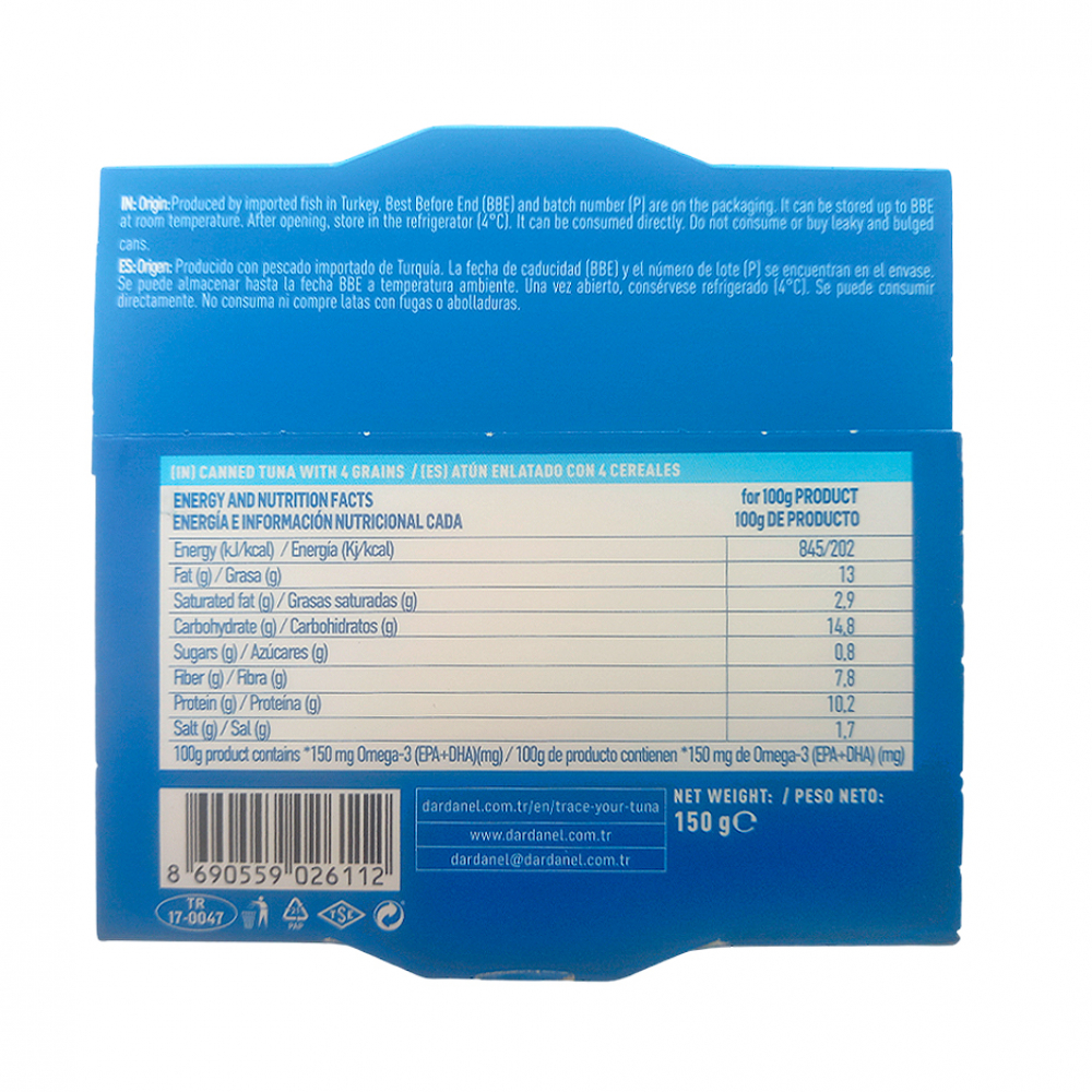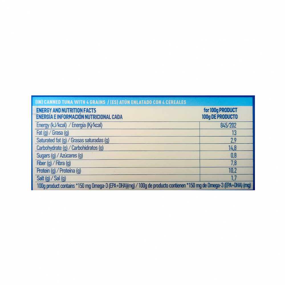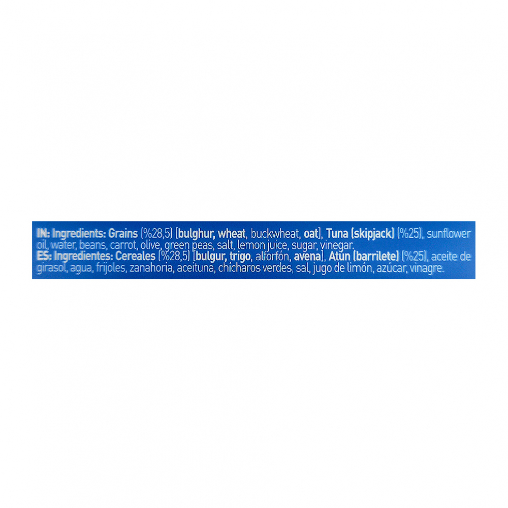 Ingredientes: Cereales (28.5 %)[ bulgur, trigo, alforfón, avena], Atún (barrilete) (25 %), aceite de girasol, agua, frijoles, zanahoria, aceituna, chícharos verdes, sal, jugo de limón, azúcar, vinagre.