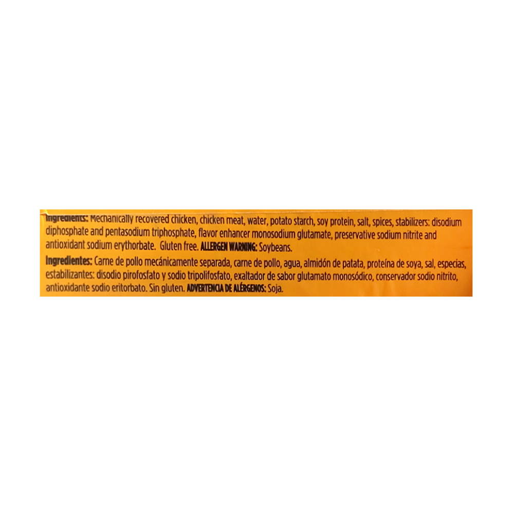 -Ingredientes: Carne de pollo mecánicamente separada, carne de pollo, agua, almidón de patata, proteína de soya, sal, especias, estabilizantes: disodio pirofosfato y sodio tripolifosfato, exaltador de sabor glutamato monosódico, conservador sodio nitrito, antioxidante sodio eritorbato. Sin gluten. Advertencia de alérgenos: Soja.