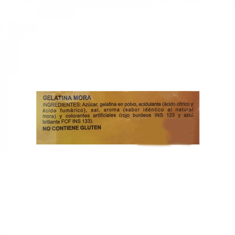 Ingredientes: Azúcar, gelatina en polvo, acidulante (ácido cítrico y ácido fumárico), sal, aroma (sabor idéntico al natural mora) y colorantes artificiales (rojo burdeos INS 123 y azul brillante FCF INS 133). No contiene gluten.