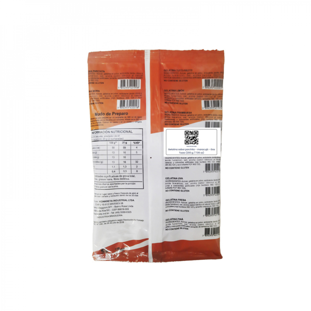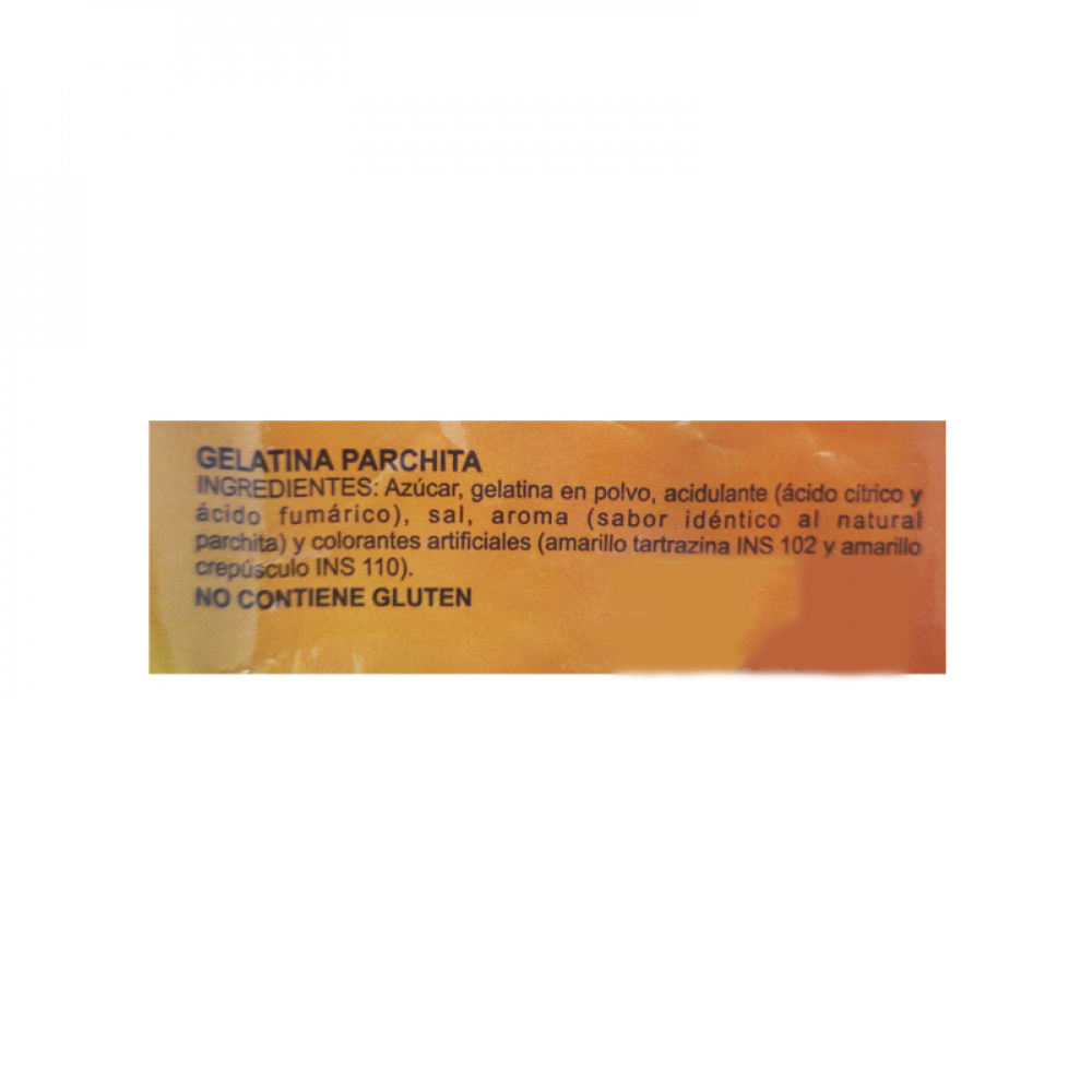 Ingredientes: Azúcar, gelatina en polvo, acidulante (ácido cítrico y ácido fumárico), sal, aroma (sabor idéntico al natural parchita) y colorantes artificiales (amarrillo de tartrazina INS 102 y amarrillo crepúsculo INS 110). No contiene gluten.