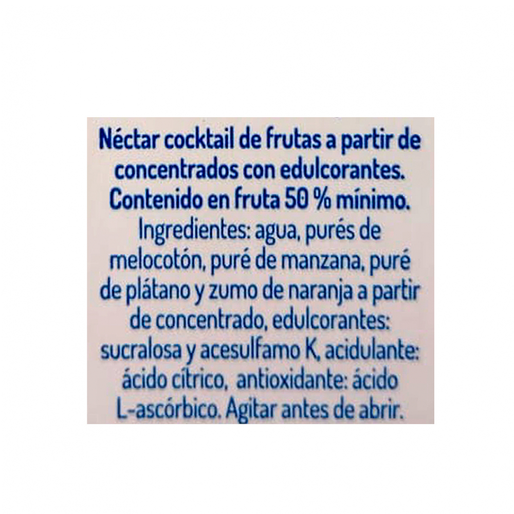 Ingredientes: agua, puré de melocotón, puré de manzana, puré de plátano y zumo de naranja a partir de concentrado, edulcorantes: sucralosa, acesulfame-k, acidulante, ácido cÃtrico, antioxidante, ácido L-ascórbico. Agitar antes de abrir. Una vez abierto conservar en frigorÃfico y consumir antes de 4 dÃas.