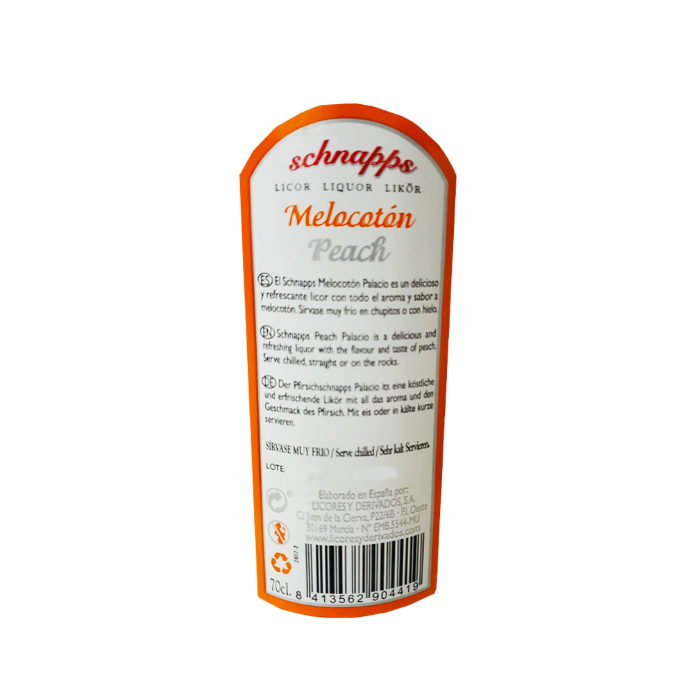 El Schnapps melocotón palacio es un delicioso y refrescante licor con todo el aroma y sabor a melocotón. Sírvase muy frio en chupitos o con hielo.