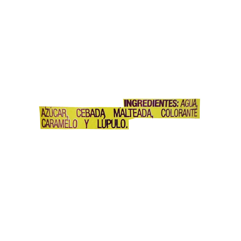 Ingredientes: Agua, azúcar, cebada malteada, colorante caramelo, lúpulo.