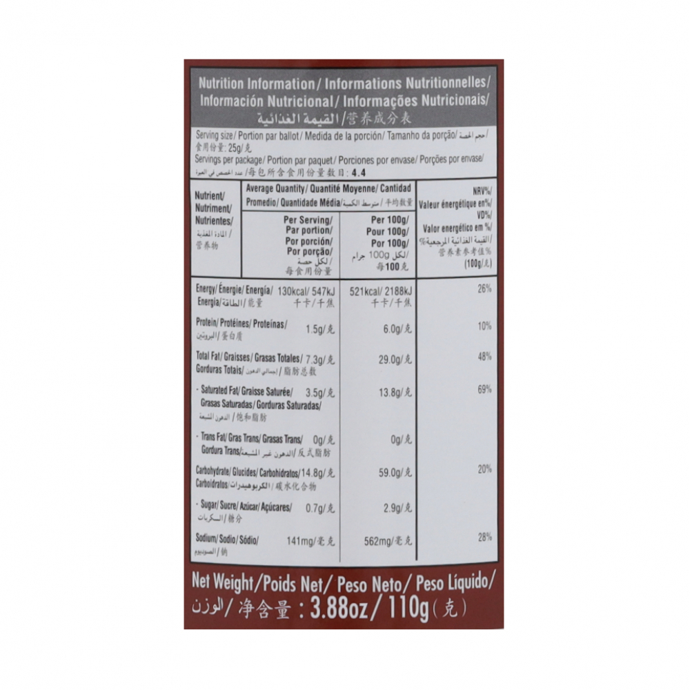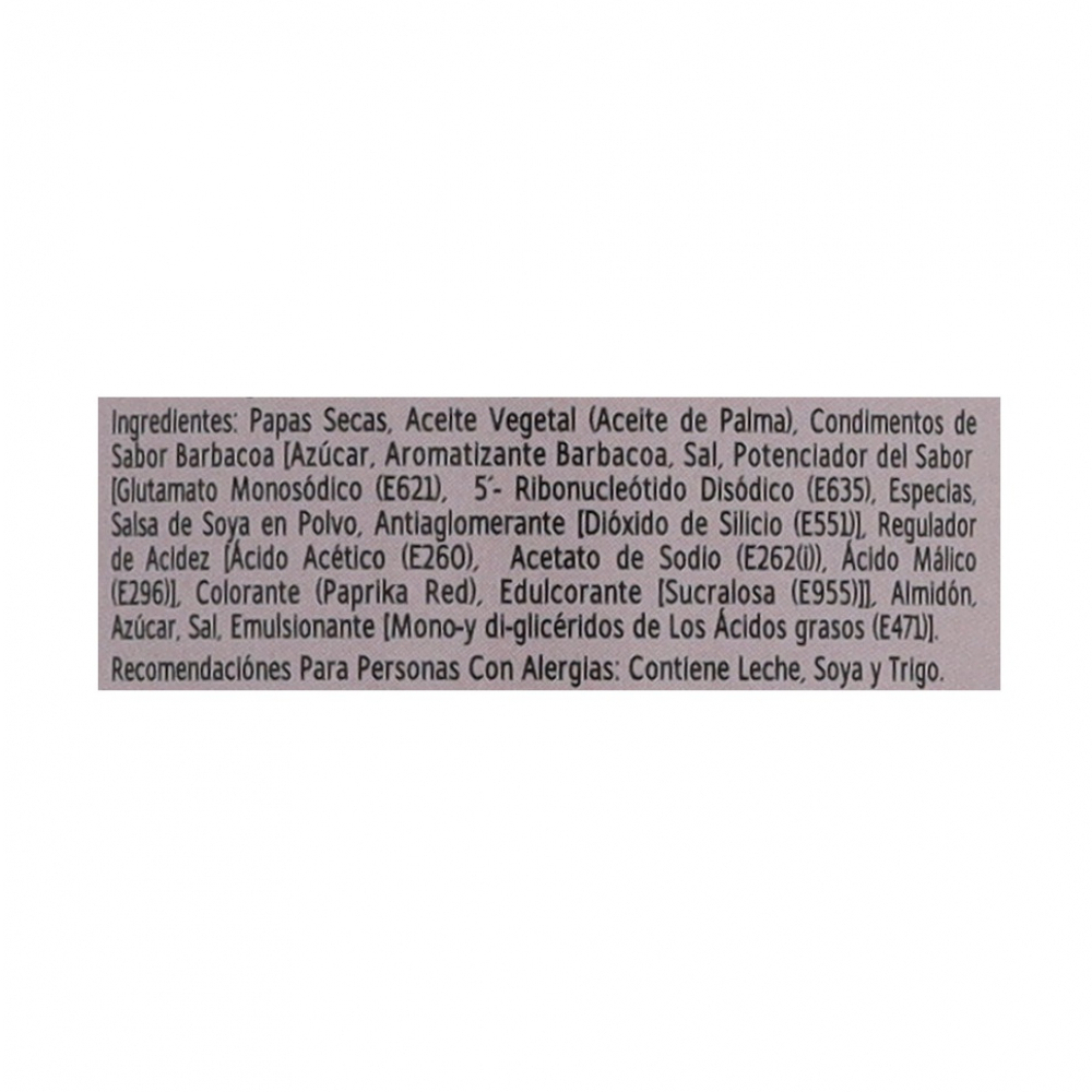 Ingredientes: Papas Secas, Aceite Vegetal (Aceite de Palma), Condimentos de Sabor Barbacoa (Azúcar, Aromatizante Barbacoa, Sal, Potenciador del Sabor (Glutamato Monosódico (E621), 5´Ribonucleótido Disódico (E635), Especias, Salsa de Soya en Polvo, Antiaglomerante (Dióxido de Silicio(E551), Regulador de Acidez, Ácido Acético, (E260), Acetato de Sodio (E262(i)), Ácido Málico (E296), Colorante (Paprika Red), Edulcorante (Sucralosa (E955)), Almidón, Azúcar, Sal, Emulsionante (Mono-y di-glicéridos de los Ácidos Grasos E471)).