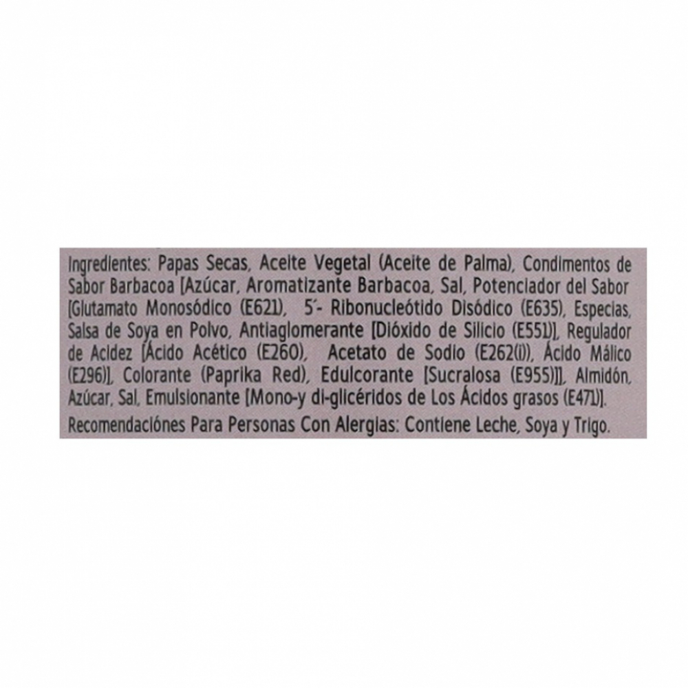 Ingredientes: Papas secas, aceite vegetal (aceite de palma), condimentos de sabor barbacoa (azúcar,