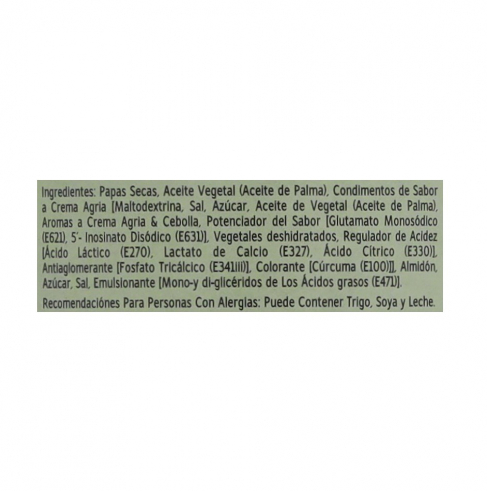 Ingredientes: Papas Secas, Aceite Vegetal (Aceite de Palma), Condimentos de Sabor a Crema Agria (Maltodextrina, Sal, Azúcar, Aceite de Vegetal (Aceite de Palma), Aromas a Crema Agria y Cebolla, Potenciador del Sabor (Glutamato Monosódico E621, 5´-Inosinato Disódico E631, Vegetales Deshidratados, Regulador de Acidez, Ácido Láctico, (E270), Lactato de Calcio (E327), Ácido Cítrico E(330), Antiaglomerante (Fosfato Tricálcico E(341iii), Colorante (Cúrcuma(E100))), Almidón, Azúcar, Sal, Emulsionante (Mono-y di-glicéridos de los Ácidos Grasos E471)).