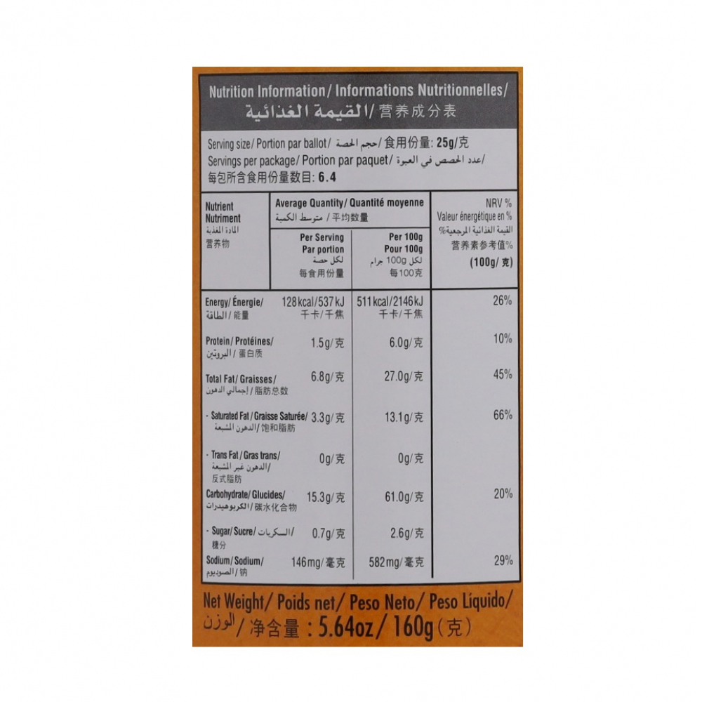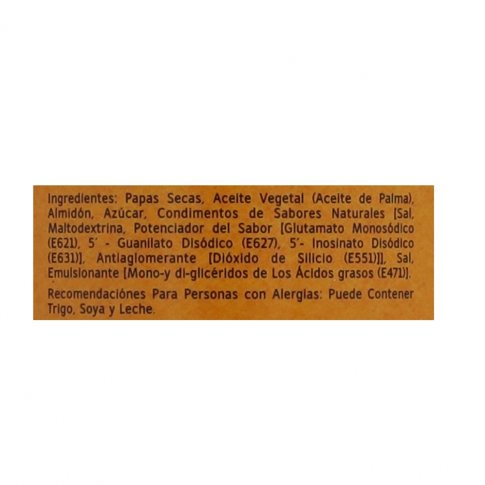 Ingredientes: Papas Secas, Aceite Vegetal (Aceite de Palma), Almidón, Azúcar, Condimentos de Sabores Naturales (Sal, Maltodextrina, Potenciador del Sabor (Glutamato Monosódico E621, 5´-Guanilato Disódico E627, 5´-Inosinato Disódico E631, Antiaglomerante (Dióxido de Silicio E551), Sal, Emulsionante (Mono-y di-glicéridos de los Ácidos Grasos E471)).