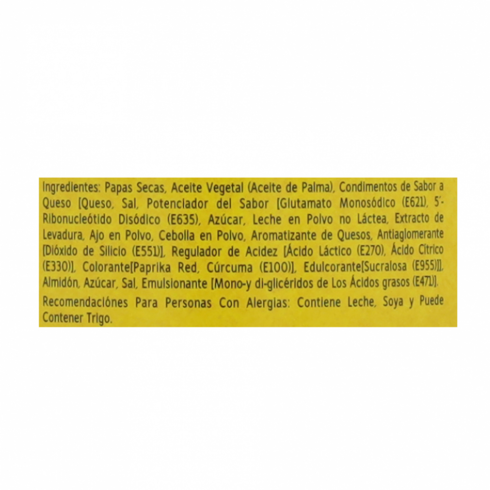 Ingredientes: Papas secas, aceite vegetal (aceite de palma), condimentos de sabor a queso (queso, sal, potenciador del sabor (glutamato monosódico E621, 5 ribonucleótido disódico (E635), azúcar, leche en polvo no látea, extracto de levadura, ajo en polvo, cebolla en polvo, aromatizante de queso, antiaglomerante (dióxido de silicio (E551)), regulador de acidez (ácido láctico (E270), ácido cÃtrico (E330), colorante (paprika red, cúrcuma (E100)), edulcorante (sucralosa (E955), almidón, azúcar, sal, emulsionante (mono-y di-glicéridos de los ácidos grasos E471)).