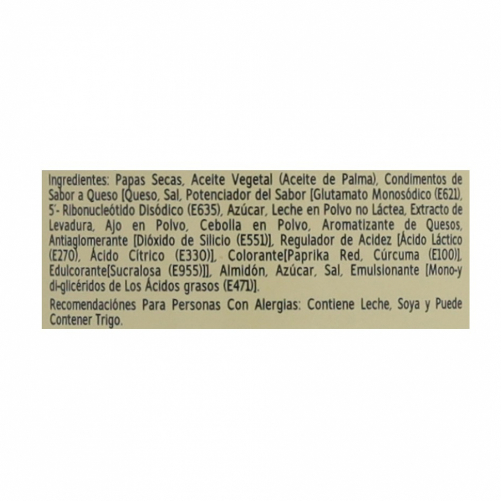 Ingredientes: Papas secas, aceite vegetal (aceite de palma), condimentos de sabor a queso (queso, sal, potenciador del sabor (glutamato monosódico E621, 5´ribonucleótido disódico (E635), azúcar, leche en polvo no láctea, extracto de levadura, ajo en polvo, cebolla en polvo, aromatizante de queso, antiaglomerante (dióxido de silicio (E551)), regulador de acidez (ácido láctico (E270), ácido cÃtrico (E330), colorante (paprika red, cúrcuma (E100)), edulcorante (sucralosa (E955), almidón, azúcar, sal, emulsionante (mono-y di-glicéridos de los ácidos grasos E471)).