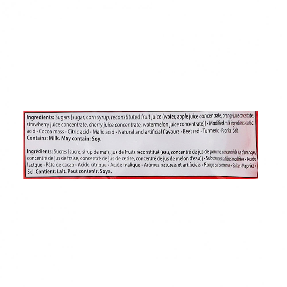 Ingredientes: azúcar, jarabe de glucosa, aceite de coco (hidrogenado), almidón, maltodextrinasaborizantes (naturales y artificiales), espesantes (goma de celulosa, goma gellan, goma arábiga), emulsificante (sucroésteres de ácidos grasos), agentes de recubrimiento (cera carnauba, cera de abeja), zumo de frutas (manzana, fresa, naranja, limón), acidulante (ácido cÃtrico, ácido málico), corrector de acidez (potasio hidróxido), colorante natural (rojo de remolacha, cúrcuma, paprika), sal, puede contener leche y/o soya.