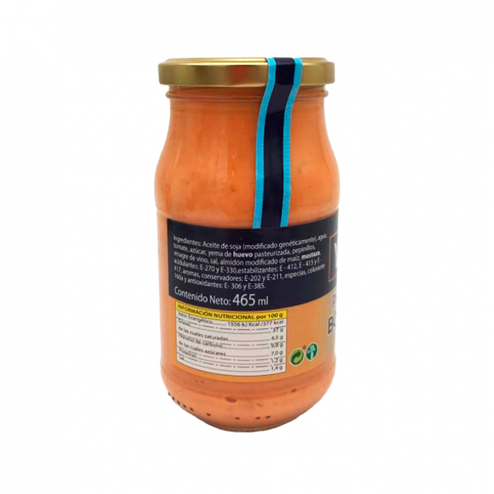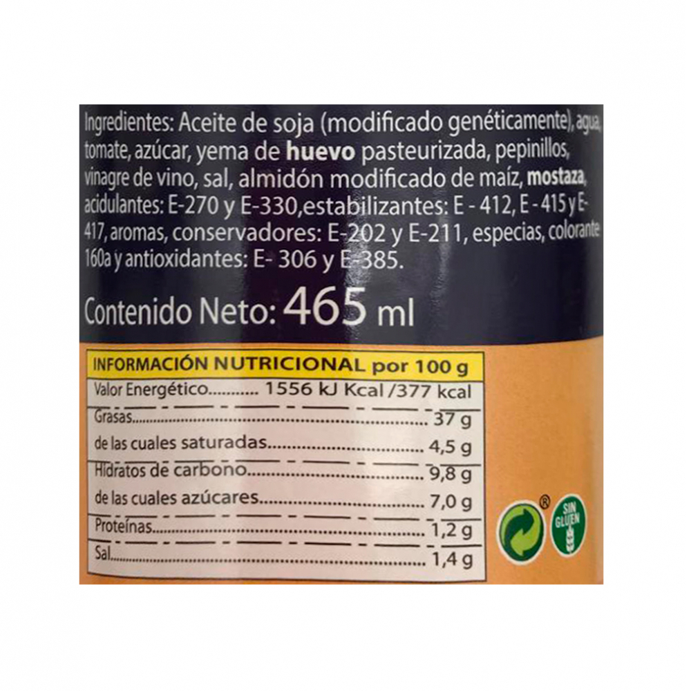 Ingredientes: aceite de soja modificado genéticamente), agua, tomate, azúcar, yema de huevo pastereurizada, pepinillos, vinagre de vino, sal, almidón modificado de maíz, mostaza, acidurante: E-270 y E-330, estabilizantes: E-412, E-415, E-417, aromas, conservadores: E-202 y E-211, especias, colorante y antioxidantes: E-306 y E-385.