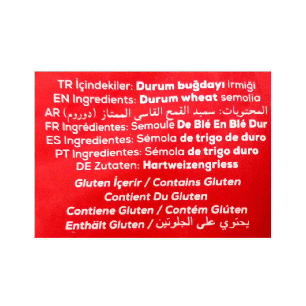 Ingredientes: Sémola de trigo duro. Contiene gluten. País de Origen: Turquía.