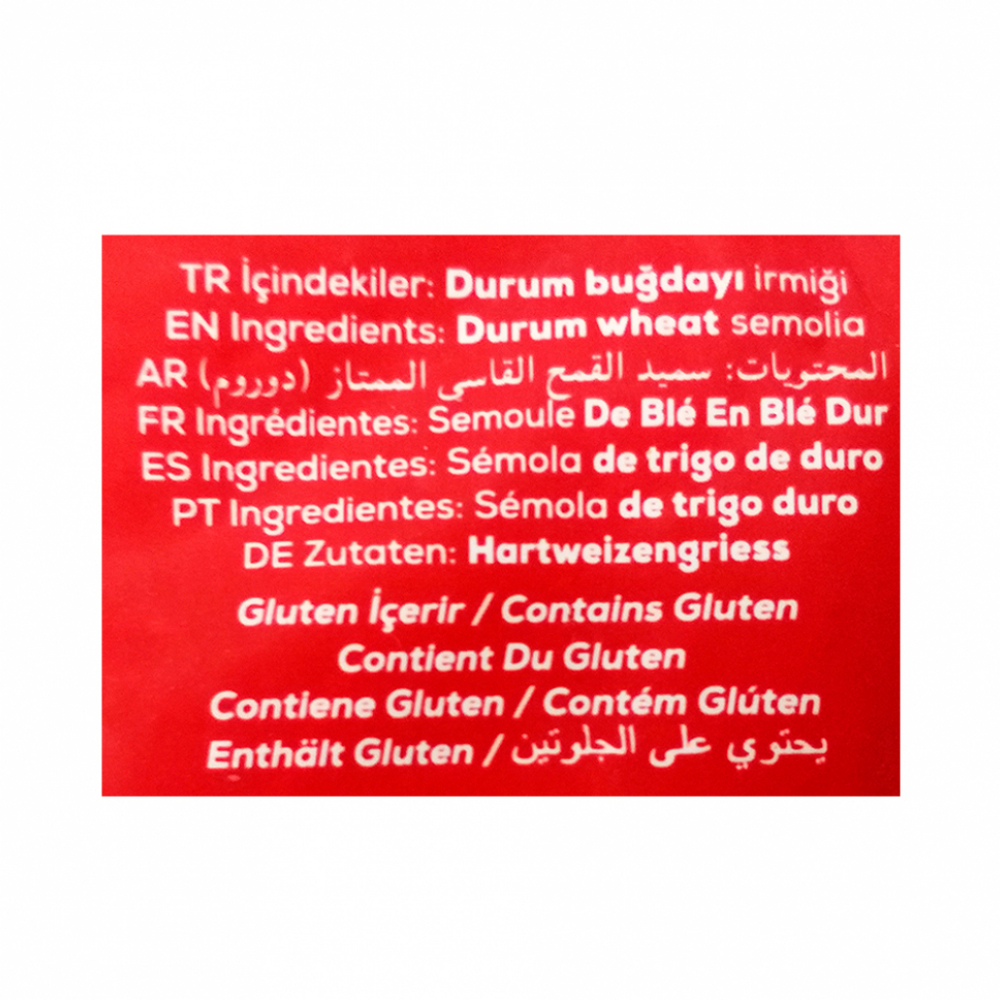 Ingredientes: Sémola de trigo duro. Contiene gluten. PaÃs de Origen: TurquÃa.