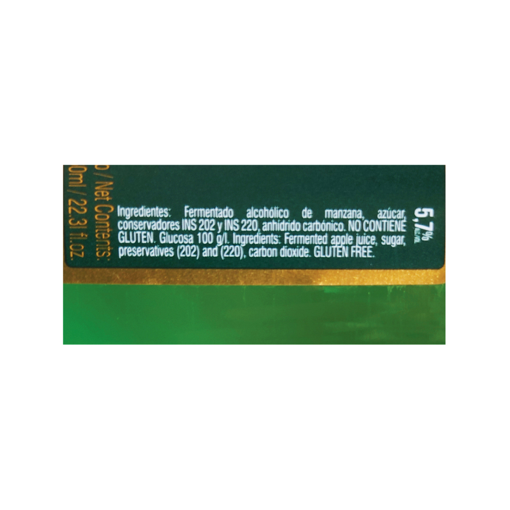Ingredientes: Fermentado alcohólico de manzana, azúcar, conservadores (INS 202 y INS 220), anhÃdrido carbónico. No contiene gluten.