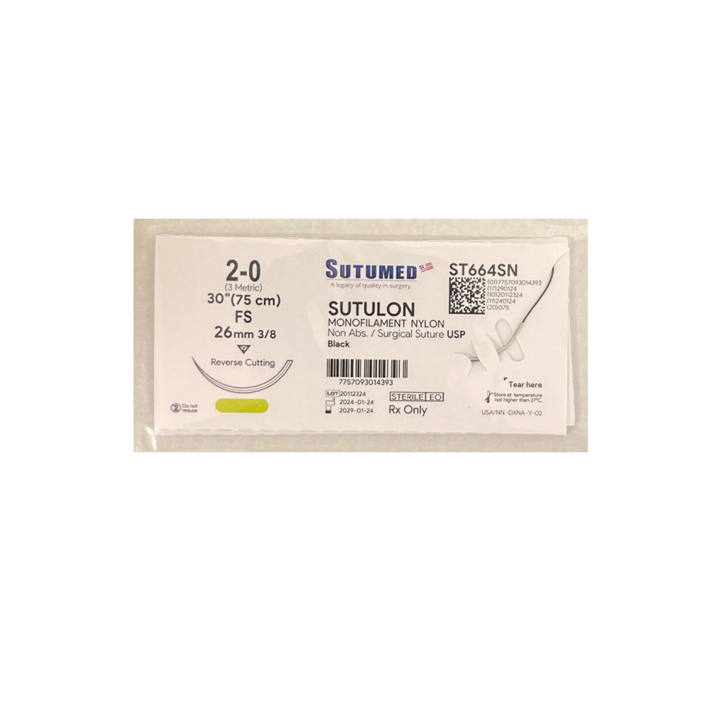 3.Especificaciones (Tipo de sutura: Nylon Longitud del hilo: 75 cm Tipo de aguja: aguja con filo Longitud de la aguja: 26 mm Tipo de curva: 3/8 Diámetro del hilo:2-0 General: Sutura de nylon no absorbible. Hilo de monofilamento. Sutura hecha de polímeros alifáticos de cadena larga de nylon. No se absorbe, se encapsula gradualmente por el tejido. Agujas siliconadas que permiten un mínimo traumatismo del tejido. Fuerza de tracción certificada. Hilo uniforme que evita el arrastre del tejido. Suavidad, flexibilidad y elasticidad que facilita el uso y la concreción de los nudos. Otras características de la sutura: Color: Negro. Tamaño de la hebra: de 11/0 a 2/0 USP. Esterilizado por óxido de etileno)