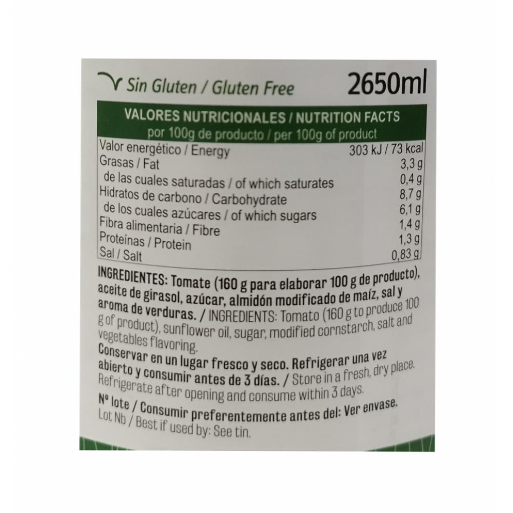 Ingredientes: Tomate (160 g para elaborar 100g de producto), aceite de girasol, azúcar, almidón mo