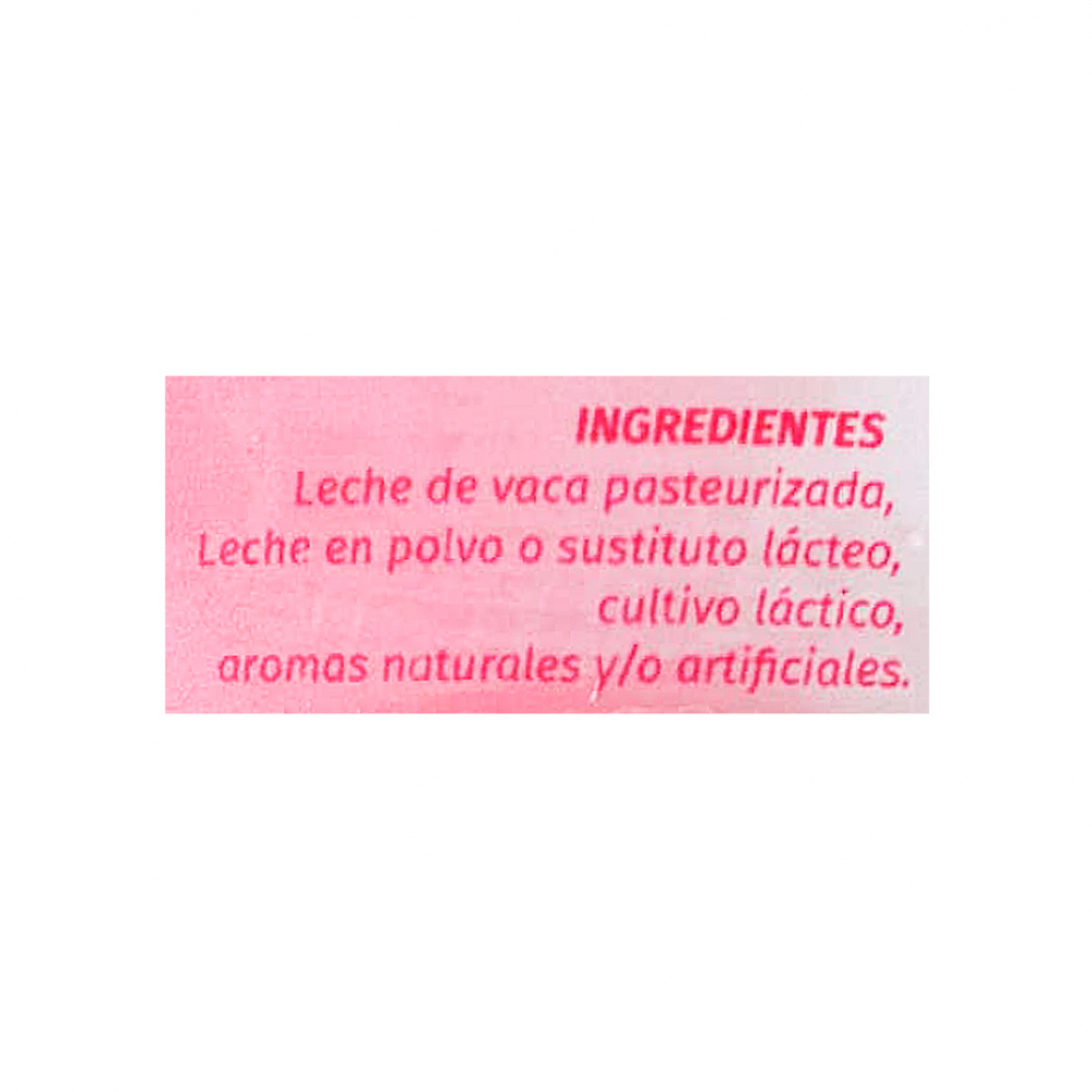 Ingredientes: Leche de vaca pasteurizada, leche en polvo o sustituto lácteo, cultivo láctico, aromas naturales y / o artifiaciales.