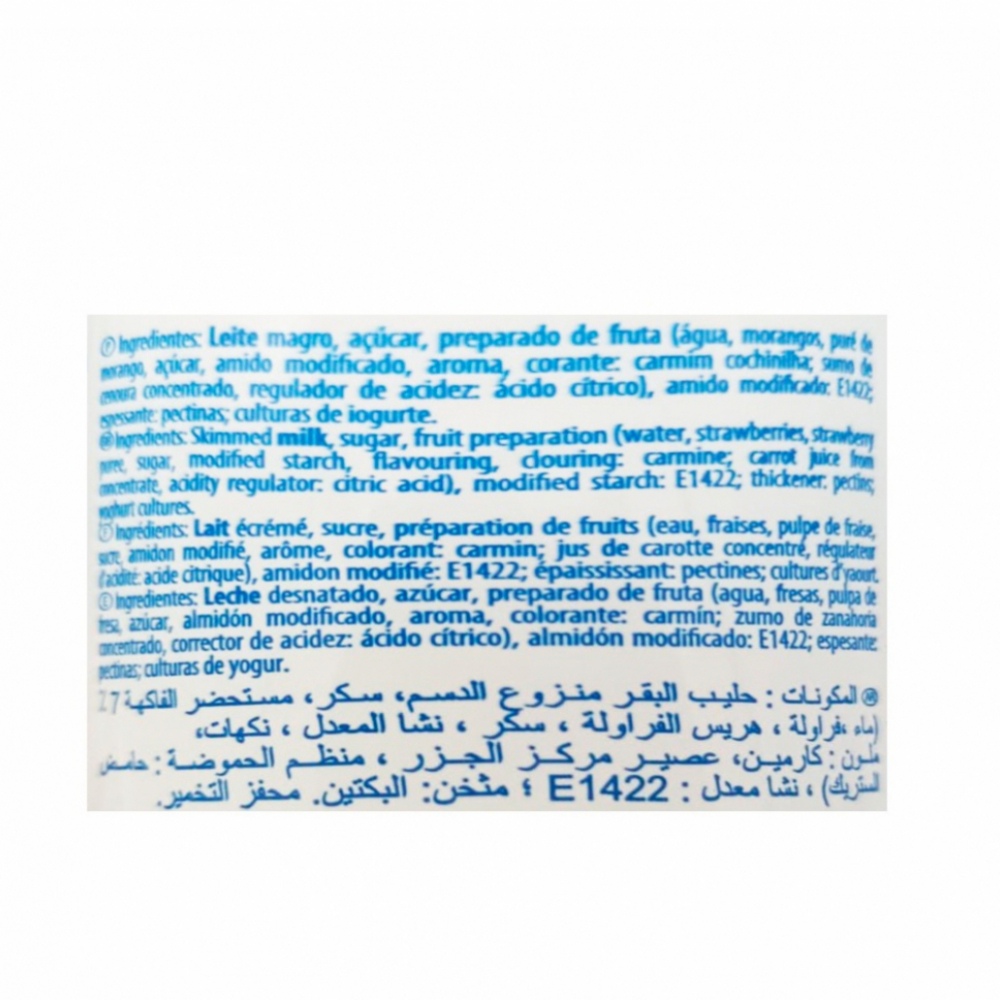 Ingredientes: Leche desnatada, azúcar, preparado de frutas (agua, fresas, pulpa de fresa, almidón modificado, aroma, colorante: carmÃn; sumo de zanahoria concentrado, corrector de acidez, ácido cÃtrico), almidón modificado: E1422; espesante: pectinas; culturas de yogurt.