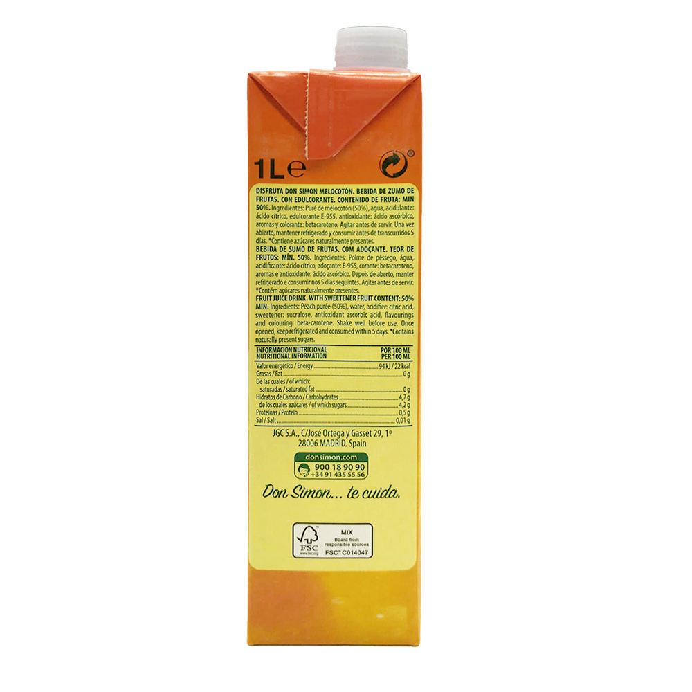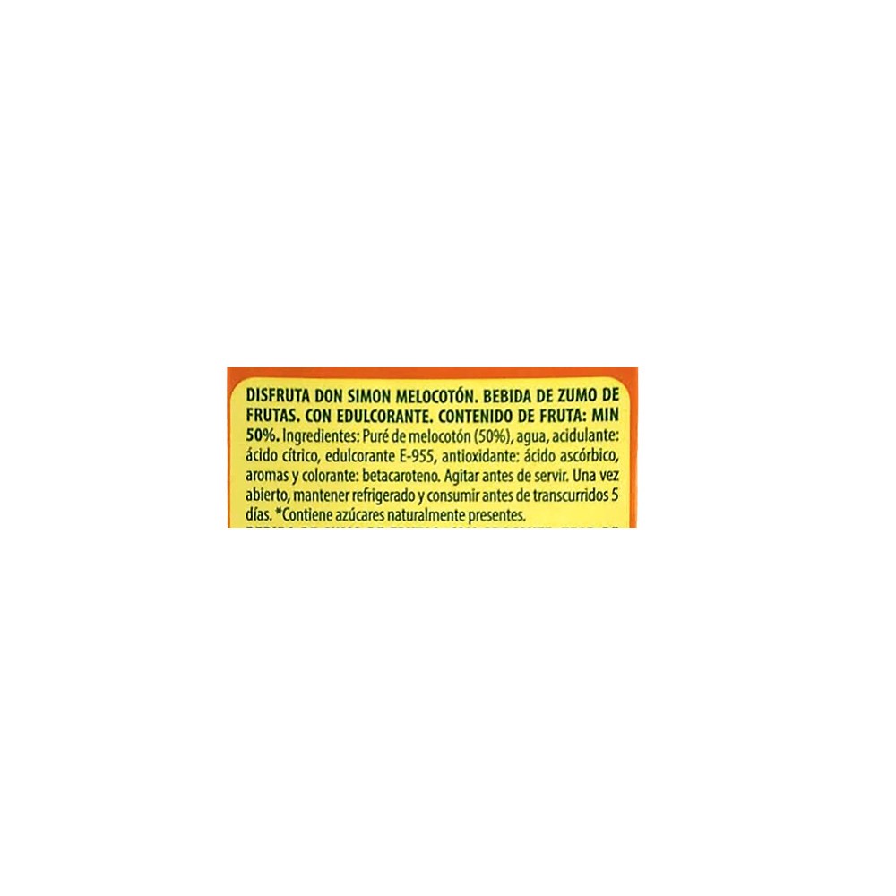 Disfruta Don Simon melocotón. Bebida de zumo de frutas. Con edulcorante. Contenido de fruta: Mínimo 50%.